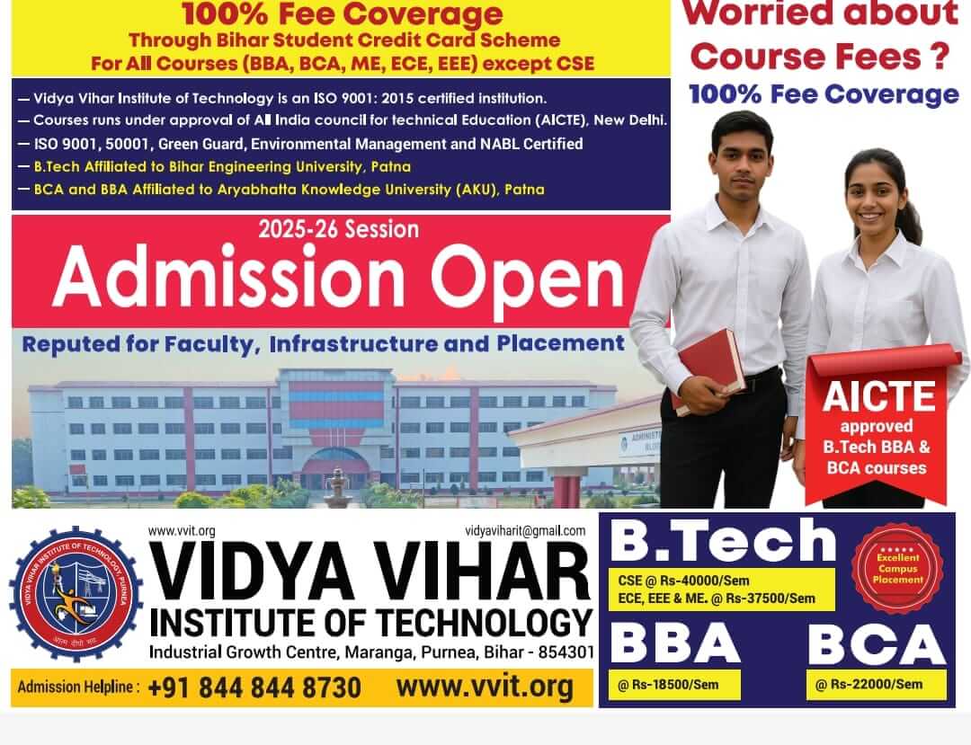 Vidya Vihar Institute of Technology is an AICTE-approved, Bihar Engineering University (for B.Tech) & Aryabhatta Knowledge University (for BBA & BCA), Patna affiliated, Co-Ed engineering college.