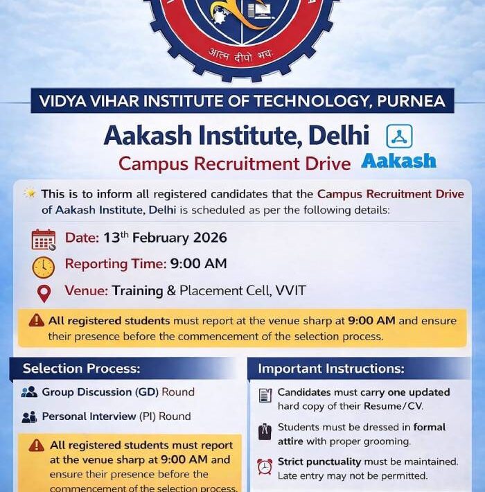 Campus Hiring Drive by Aakash Institute, Delhi at VVIT Purnea